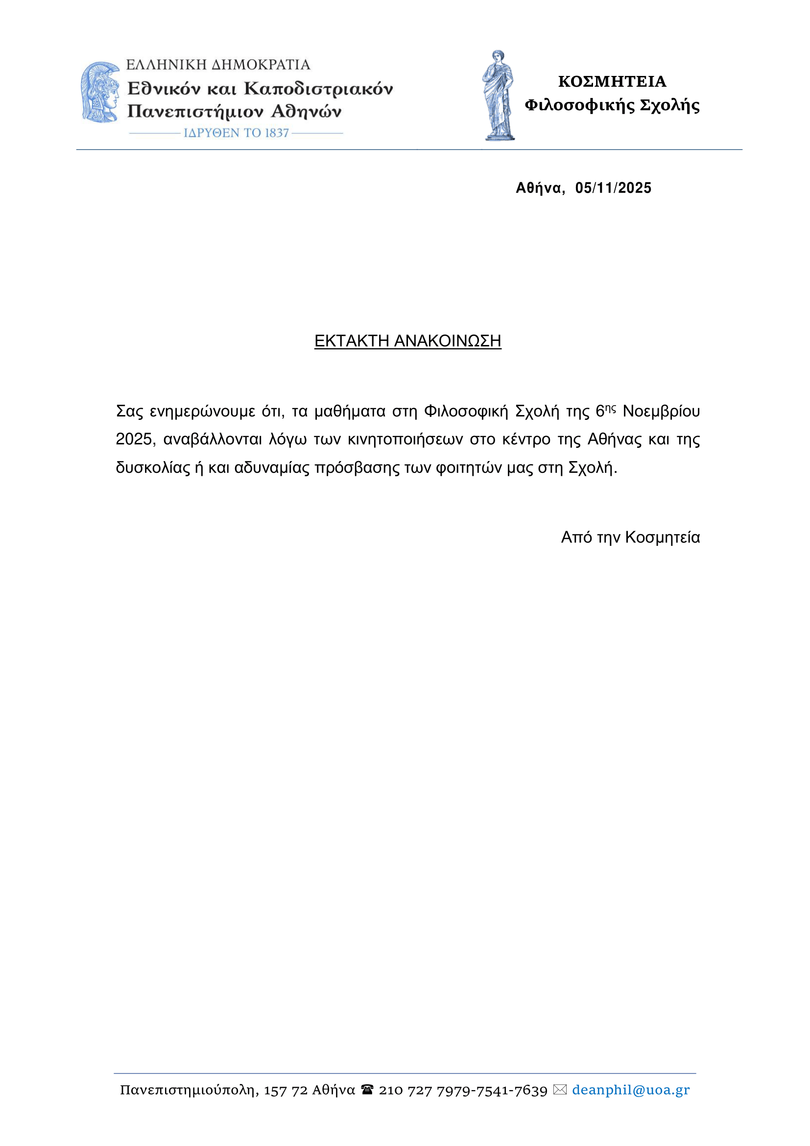 ΕΚΤΑΚΤΗ ΑΝΑΚΟΙΝΩΣΗ