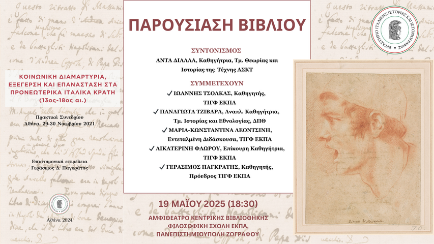 Το Εργαστήριο Ιταλικής Ιστορίας και Ιστοριογραφίας του Τμήματος Ιταλικής Γλώσσας και Φιλολογίας ΕΚΠΑ σας προσκαλεί στην παρουσίαση του βιβλίου «Κοινωνική διαμαρτυρία, εξέγερση και επανάσταση στα Προνεωτερικά Ιταλικά Κράτη (13ος -18ος αι.). Πρακτικά Συνεδρίου (Αθήνα, 29-30 Νοεμβρίου 2021)», (επιμ.) Γεράσιμος Δ. Παγκράτης, εκδ. ΕΚΠΑ, Αθήνα 2024, 700 σσ.